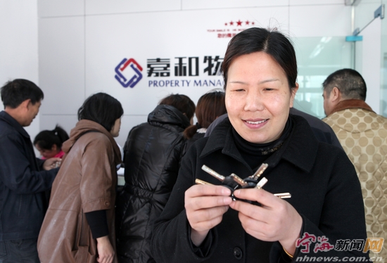 宁海新闻网讯 日前,市民叶女士拿到经济适用房阳光小区的住房钥匙后,高兴得合不拢嘴。这批经济适用住房为第二期第二批,共建有227套,每套面积在65平方米左右,为中低收入家庭提供紧凑合理的户型设计。据了解,目前我县经济适用房共已建造1000多套,已有900多户困难家庭拿到钥匙入住。(李江林胡惠祥摄) |