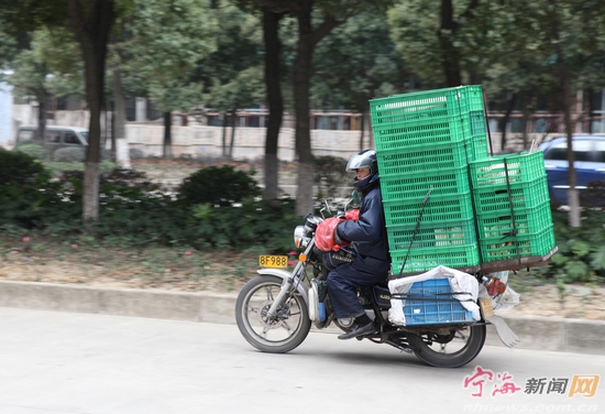 宁海新闻网讯 这辆两轮摩托车超高又超宽,载物量堪比三轮了,实在不安全。——记者惠广亮摄于兴宁北路