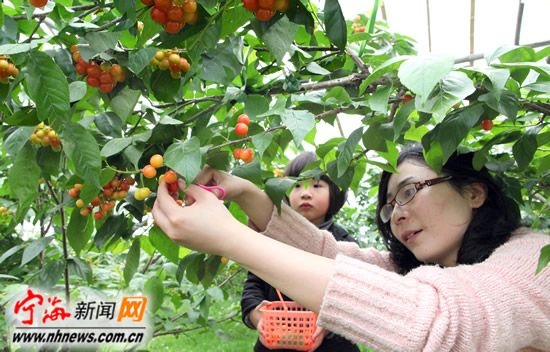 宁海新闻网讯 昨日上午,一名市民带着小孩正在梅大樱桃观光园采摘樱桃。宁海梅大樱桃有限公司是由梅林街道梅北经济合作社和深甽镇大洋村经济合作社共同投资的集体企业,所属的梅大樱桃观光园系宁波市科协、宁海县科协共同投资建设的扶贫项目,浙江大学樱桃种植基地之一。前年初,该园从浙大农科院引进杂交樱桃5000株,按绿色无公害标准培育,目前60亩樱桃已试种成功,填补了宁海樱桃规模种植的空白。 (记者李江林摄) |