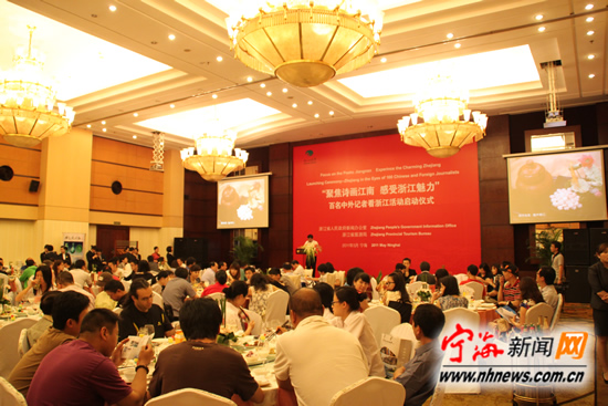 5月18日中午,“‘聚焦诗画江南 感受浙江魅力’百名中外记者看浙江”活动启动仪式在宁海举行,仪式上主办方向记者们介绍了浙江旅游和宁海旅游的基本概况。据了解,共有来自国内外的一百多名媒体记者参加了启动仪式。图为启动仪式现场。
