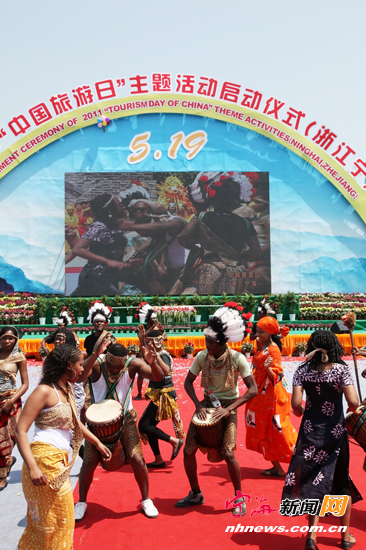 宁海新闻网快讯 (记者 惠广亮)5月19日,2011年“中国旅游日”主题活动启动仪式在《徐霞客游记》开篇地浙江宁海县举行。第九届中国徐霞客开游节同时开幕。启动仪式由国家旅游局、浙江省人民政府主办,宁波市人民政府、浙江省旅游局承办,宁波市旅游局、宁海县人民政府执行承办。全国人大常委会副委员长路甬祥宣布中国旅游日主题活动启动。图为开游大典盛况。