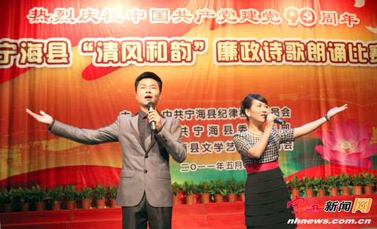 宁海新闻网讯 昨日晚上,由县纪委、县委宣传部、县文联共同主办的庆祝中国共产党成立90周年宁海县“清风和韵”廉政诗歌朗诵比赛在县越剧团剧院举行,来自全县各条战线的16个代表队参加了决赛。县委副书记、县纪委书记徐光宪到场,并为荣获第一名和优秀组织奖的单位颁奖。图为选手正在朗诵。 (记者李江林摄)清风和韵促廉政 |