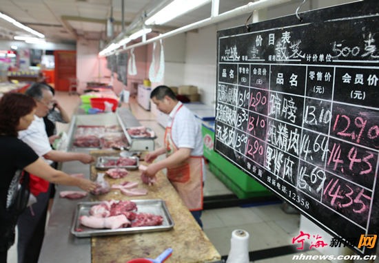 宁海新闻网讯 昨日上午,城区一家超市猪肉摊位的标价牌上显示,零售价无骨后腿肉每500克13.30元、纯精肉每500克14.64元、里脊肉每500克15.69元。超市工作人员对记者说,现在的这个价格是近日才提上去的,菜市场里的价格应该比这个还要高些。据悉,中国肉类协会副秘书长高观近日表示,从2010年5月份以来的13个月里,国内猪肉价格持续上涨,全国白条猪平均出厂价从最低时的约9元/公斤涨到目前的17.45元/公斤,已超过2008年时17.16元/公斤的历史最高价,创出新高。(记者惠广亮摄) |