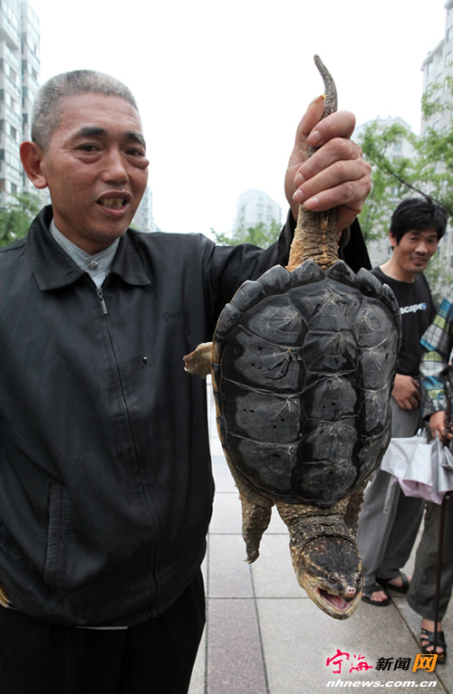 宁海新闻网讯 日前,家住东景花园的吴师傅在水库钓鱼时钓上了一只似鳖不像鳖似龟不像龟的东西,记者看到这只东西有一根20多厘米长的尾巴,尾巴长得与鳄鱼一样有背刺、肚子与腿的样子像鳄鱼表皮。为此,记者与吴师傅来到海洋渔业局,经专家认定是一只国外引进的宠物龟——鳄龟,尽管不是国家保护动物,昨日吴师傅还是将这只鳄龟进行放生。(记者李江林摄) |