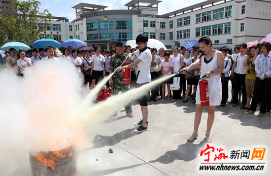 宁海新闻网讯 6月24日上午,宁波太平洋百货集团有限公司的百余名员工来到县公安局消防大队进行消防知识培训。通过培训,使广大员工掌握了正确的灭火技巧。图为员工们正在轮流进行灭火训练。(记者李江林摄)