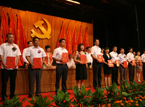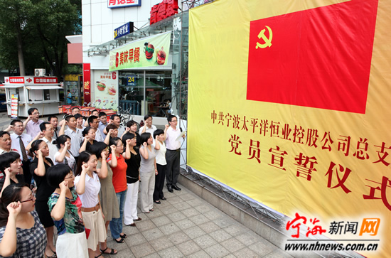 图为宁波太平洋恒业控股公司党员正在参加集体宣誓。 (记者李江林摄) “我志愿加入中国共产党,拥护党的纲领,遵守党的章程,履行党员义务;执行党的决定,严守党的纪律,保守党的秘密,对党忠诚,积极工作,为共产主义奋斗终身,随时准备为党和人民牺牲一切,永不叛党。”7月1日上午,宁海汽车总站广场前,长运公司全体党员一起宣誓,向建党90周年献上自己的心声。 当天,我县上万名党员一起开展宣誓活动,在全县掀起了庆祝党的生日高潮。在县财政局,全体机关党员来到广场,齐声宣誓,表达了对党的深厚感情;在长街镇,党员们来到香花山烈士陵园,在庄严的环境中重温了入党誓言;在胡陈乡,中堡溪村党员们用嘹亮的誓言表达了建设新农村,再创新业绩的豪迈之情;在太平洋百货,全体党员在百货广场高声宣誓,表达了喜迎建党90周年的喜悦之情。 鲜艳的党旗下,党员们的誓言铿锵有力。宣誓结束后,他们还将以饱满的热情投入到工作中,结合自己的岗位特点和工作职责开展形式多样的岗位奉献服务活动,以实际行动向党的生日交出一份礼物。宁海财税局财政监督科科长赵中华激动地对记者说:“作为一名共产党员,重温入党誓词,使我时刻能够牢记党的宗旨,全心全意为人民服务。作为一个财税人来说,我觉得我们要以更加饱满的精神,更加昂扬的斗志,投入到我们财税事业里面来,为提高人民群众生活水平,推动宁海县域经济快速发展而努力。” (记者王银宁实习生林函) |