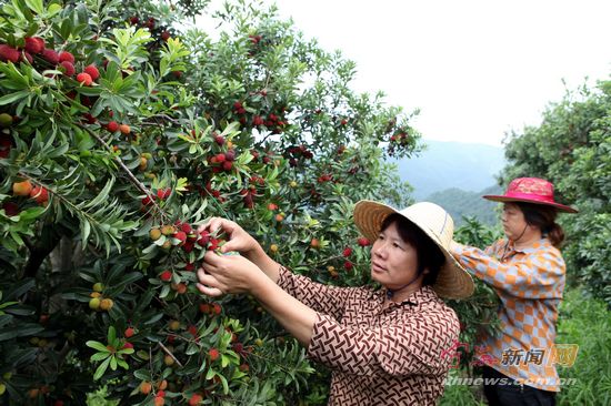 宁海新闻网讯 昨日上午,力洋乡亲浓果园的女工们正在采摘东魁杨梅,该杨梅正以每公斤30至36元不等的价格畅销宁波市场。据乡亲浓果园蒋善福介绍,该园杨梅种植面积约150亩,由于今年是小年,杨梅产量不高,预计可产杨梅30000公斤左右,收入可达100万元。 (李江林沈波摄)