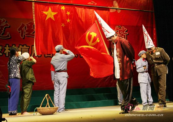 宁海新闻网讯 日前,县农村信用合作联社隆重举行了“庆建党促发展创和谐”文艺晚会。该社员工以自编自演的朗诵、四句半、舞台剧、合唱、舞蹈等形式,共同回顾90年来党领导中国人民进行革命、建设和改革的光辉历程,表达了他们将充分发挥基层党组织战斗堡垒作用、党员先锋模范作用,推动全体干部员工立足岗位,扎实做好本职工作,努力成为和谐发展促进者的信心与决心。图为晚会上前童、桑洲信用社员工正在浓情上演舞台剧《红色记忆》。(记者惠广亮摄) |