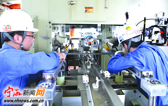 宁海新闻网讯 昨日,山中合金(宁波)有限公司生产车间里,来自日本的工程师正在安装调试与压机配套的自动搬运机械手装置。山中合金是一家专门生产高端汽车传动轴、转向轴等机械产品的公司,自2003年投产以来,就一直十分注重技改投入,以不断提高生产效率。今年技改投资500多万元,即将投产的2台自动搬运机械手装置,每年可节省人工、模具损耗等直接成本80多万元。预计2011年销售收入可达8000万元,公司人均年产值为66.6万元,比2009年人均年产值提高一倍。(惠广亮 金晓丽 摄) |