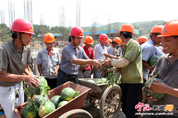 宁海新闻网讯 昨日上午,浙江腾宇建设有限公司组织人员怀着感恩的心,带着几千公斤西瓜和人丹、风油精、清凉油等防暑药品来到宁海马郎山农民公寓,慰问整天在野外作业的农民工兄弟。天气炎热,工地成了一只大火炉,这些农民工兄弟头顶烈日忘我地工作着,既确保了工程的质量,又保证了工程的进度,为宁海的经济建设作出了贡献,“社会感恩是平等的,员工感恩公司,公司也同样感恩员工,他们是公司的财富,没有他们公司也不会有今天的辉煌。”一位公司领导有感地说。(记者李江林摄) |