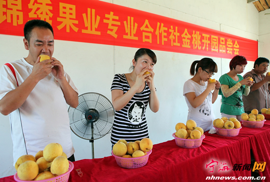 昨日上午,岔路镇王爱高塘村桃园里正在进行吃金桃比赛。由于今年风调雨顺,县锦绣金桃果业专业合作社1200亩桃园于昨日开园采摘,金桃个大(大的可达0.6公斤)、糖度高、外观美、口感爽、汁水多,深受消费者喜爱。目前,该合作社的社员们正忙着采摘金桃、包装,并以每公斤14-20元不等的价格销往宁波、杭州、上海等地市场。(记者李江林摄) |