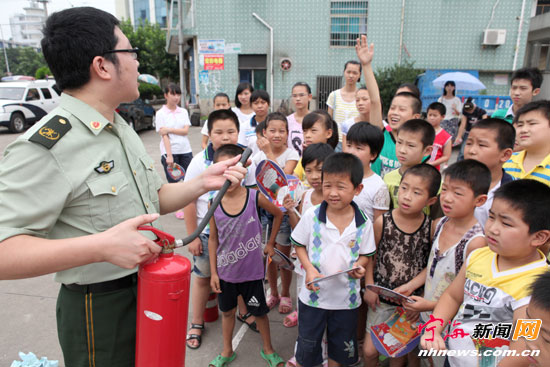 宁海新闻网讯 日前,县青少年安全自护教育“直通车”活动走进桥头胡街道,为当地的青少年送去安全自护知识。该活动是团县委今年8月份推出的宁海县青少年安全自护教育行动的活动之一。图为县消防大队的警官正在给孩子们讲解有关火灾避险逃生、灭火器使用方法等知识。(记者惠广亮摄)