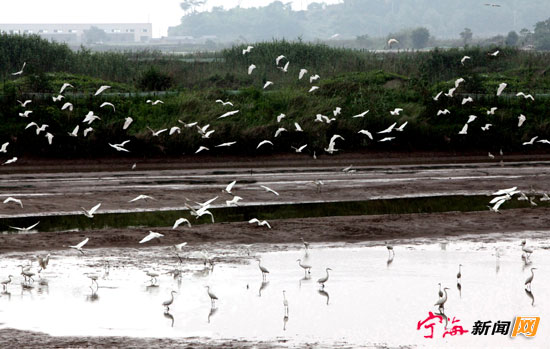 宁海新闻网讯 日前,记者在越溪乡一个荒塘里看到,塘水很浅并露出许多湿地,数百只乃至近千只白鹭在这块荒塘里小憩、飞舞、戏闹、觅食……近几年来,我县生态环境不断改善,人们爱护鸟类的意识不断加强,一些鸟类纷纷在我县各地落户并不断繁殖,像白鹭这类水陆两栖鸟类都在山边落户、海边觅食,一些荒塘湿地成了它们最佳憩地。(记者李江林摄) |