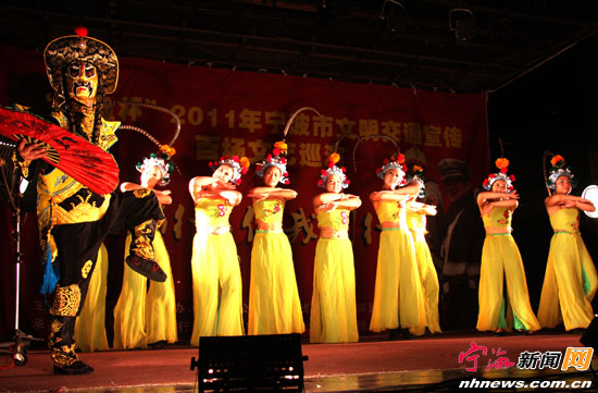 宁海新闻网讯 由宁波市文明办、宁波市公安局交警支队和宁波保险行业协会联合举办的“保险杯”2011年宁波市文明交通宣传百场文艺巡演团于8月30日至9月3日在宁海连续演出。演出节目丰富多彩,有交通安全知识问答、歌舞、小品、杂技等,并将交通安全知识融入文艺表演,为当地群众送去文化大餐的同时,也增强了他们的文明交通意识。图为9月3日晚巡演团在梅林街道大路周村演出时,演出团正在表演《俏花旦戏脸谱》,受到村民的欢迎。(李江林 周衍平摄) |