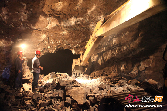 宁海新闻网讯 总投资1.06亿元的马鞍岭隧道于昨日上午贯通,马鞍岭隧道采取上下行分离式,总长2188米,宽11米,是甬临线梅林至岔路桐洲段改建工程重点之一。右洞在今年6月15日提前贯通,左洞于9月28日提前三个月贯通,整个工程力争在2012年10月前完工。图为挖掘机正在挖掘隧道石块。 (记者李江林摄) |