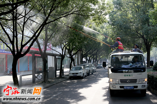 宁海新闻网讯 为加强城区绿化树木的病虫害防治,迎接国家园林县城验收,连日来,县园林管理局组织园林工人对城区主干道上的行道树进行药物喷洒,以彻底消灭病虫害,保持树木的正常生长和观赏效果。图为园林工人正在对人民大道行道树喷洒无公害灭虫药水。(记者惠广亮摄)