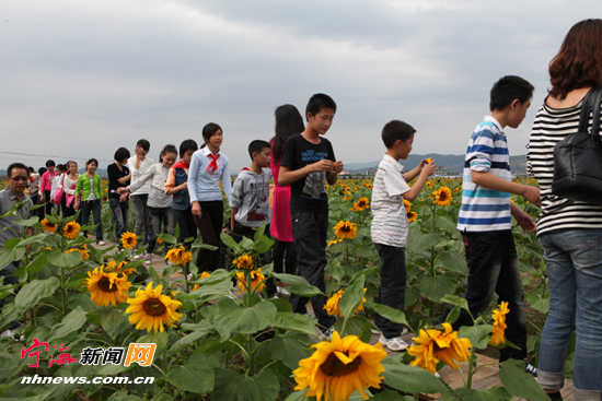 宁海新闻网讯 昨日上午,一群学生正在欢乐佳田看向日葵。时下正是向日葵盛开季节,许家山300亩向日葵和欢乐佳田50余亩成片向日葵竞相盛开,吸引了来自宁波、台州等地的一批批摄影爱好者和游人的眼球。这些观赏型向日葵花期长,为秋天增添了不少韵味。 (记者李江林摄)