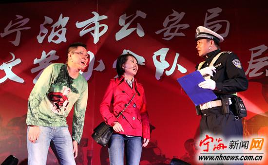 宁海新闻网讯 日前,市公安局文艺小分队队员正在潘天寿广场表演小品《自作自受》。宁波市公安局文艺小分队基层行活动来到宁海,旨在活跃基层文化生活的同时,进一步向广大市民展示人民公安忠于职守、公正执法、为民服务的良好形象。舞蹈、二胡独奏、知识问答、联唱等丰富多彩的文艺节目,受到了广大市民的欢迎。(李江林周国亮摄) |