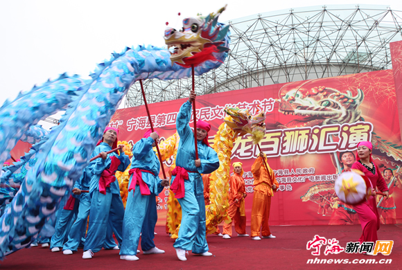 宁海新闻网讯 11月16日,“欢乐新农村”宁海县第四届农民文化艺术节“农林杯”百龙百狮汇演在潘天寿广场上演。来自全县各乡镇(街道)的近30支舞龙、舞狮队参加了汇演,表演形式有经过精心编排、推陈出新的独龙、双龙、单狮、群狮等,富有地方特色。此次汇演不仅展示了广大农民朋友积极向上的精神风貌,更是让大家领略了龙狮文化的独特艺术魅力。 (惠广亮 徐荻摄)