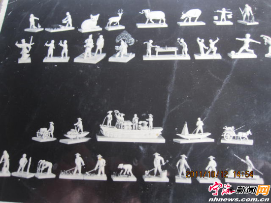 当年去故宫参加展览的作品 二、 1963年,徐永水迎来人生的一个机会,他被保送到“浙江美术学院”进修。在美院,他看到了一些以前老艺人制作的最好的“白木小件”作品。这些作品线条简单空灵,人物栩栩如生。在合作社里,他一直以速度为荣,觉得自己已经能够制作出最好的白木小件作品了。可站在这些作品前,他忽然有一种挫败感。不久后,他开始专项进修“白木小件”的艺雕课程。这一段时间的进修,给了他一种全新的体验。 徐永水说,白木小件之所以吸引人,最大的一个特点,是它真实地反映了广大劳动人民最真实的生活和劳作状态。而此前,他却忽视了这一点,他总是将最大的注意力放在人物造型上,当然,人物造型也很重要,但只凭人物造型,白木小件作品是不成立的,事实上,白木小件最吸引人的是它的场景感,它真实反映着一个生活内容或者劳作内容的场景。意识到这一点后,他开始留意原先被他忽视的身边的“题材”。比如天旱时田里的车水农具,有单人双臂摇动的,也有两个人伏在单杠上脚踏车水的;有风力带动转轮车水的,也有牛拉动盘轮车水的。为了弄清楚这些车水工具真正的构造和差异,他无数次地跑到乡下田头,仔细观察水车的结构、造型、度量尺寸,然后,他又回到合作社,将这些“庞然大物”转化成微型小件。水车是由“龙头”、“龙骨”、水车板、外壳组成,由人牵动“龙头”,“龙头”的转轮带动“龙骨”,“龙骨”带动水车板,再由水车板在车壳里带动水,这样周而复始把水从低处引往高处的田里。随后,他根据这些资料制造出了17公分左右的水车壳,“龙骨”则控制在每节1公分,由17个“龙骨”组成一个活动的骨骼。如果是牛车水,他就安排牧童赶牛,水车、牧童、车水盘三大件,范围仅仅固定在8公分内。如果是脚踏水车,就在单杠上安排两个人物,举足踏轮,踏轮带动“龙头”,“龙头”带动“龙骨”,龙骨牵动水车板,水车板推动水源,水就自然而然引入高处,流向稻田里。此外,风力水车、牛盘车水等等也都按同样的原理,根据实物微缩到极小的工艺木雕来制作,供人观赏。 到了1976年,白木小件的好时光开始走到了尽头,出口量从每个月10000多件锐减到了1000多件。从事这个行业的,也只有10来个人。徐永水说,白木小件制作这个行业有着他的局限性,人不能太多,因为出口量就那么多,规模不可能做得很大。所以,这个行业的制作人员一直都比较固定,最多40几个人,缺乏流动性。此外,随着时代的变迁,很多手艺人的观念都在转变,都更愿意去做一些实用性的东西,比如家具之类的,对于这些纯粹观赏性的东西,反而失去了从业的兴趣。 上世纪九十年代初,由于企业合并,工艺美术厂合并入塑料二厂,徐永水也从美术厂转入了林特局园林处。雕刻师放下雕刀转了行,“白木小件”也因此走下了历史舞台,从众多的民间工艺品中销声匿迹。