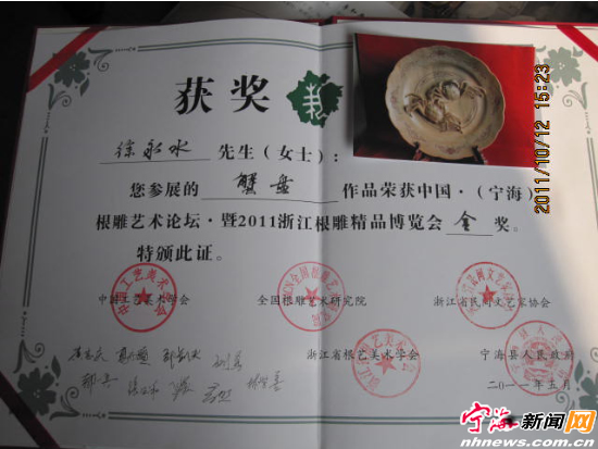 作品曾获省金奖 三、 这样,一直到了2010年的春天,“宁海新升泰艺术品有限公司”的总经理、也是工艺美术行业协会会长孙伟荣,在挖掘宁海民间工艺文化遗产时,无意间从艺术品信息中获悉了“白木小件”。这个信息引起了他的高度关注,随后,他追根寻源,找到了当时已从园林处退休的徐永水。他告诉徐永水,他希望能重新挖掘白木小件这件民间工艺品的文化遗产。孙伟荣的造访唤起了徐永水已经疏远了将近30年的与白木小件有关的记忆。随后,他整理出了已经许久没有动过的雕刀工具,试着开始动刀。为了找回当初的感觉,他又约来了原工艺美术厂的雕刻友人严望培,一起到黄坛老年协会博物馆参观,两人一起探讨样品制作方案,并制作出了一系列新的作品。 徐永水说,白木小件在中国所有的雕刻作品中,是非常另类的一个品种。首先,它的体积小,采用直线条的雕刻技法,淳朴自然,适合在手中把玩,完全天然的木纹,不加任何油漆。此外,它的材料是白茶树,之所以选择白茶树,是因为这种木料细腻、结实、光洁度好,纹理清晰自然,而且它因为生长缓慢,最多可以长到30多公分,只适合做小件。很少能从别的雕刻作品中看到白茶树的材料。当然,最重要的一点是,白木小件作品反映的都是最真实的民间生活。其他门类的雕花作品往往会选择帝王将相、才子佳人的题材,但惟独白木小件这门手艺,一直真实地反映着古代劳动人民的农业生活,有一种独特的、难得的“土味”。 徐永水说,现在,白木小件正在准备申报中国非物质文化遗产。这是好事,自己也乐意用自己的余生来挖掘恢复这门古老的手艺。但让他担心的是,自己已经70多岁了,现在却没有一个徒弟。如果这样,这门手艺终有一天还是会失传的。“我对白木小件的感情很深,我真怕那一天会真的到来。” |