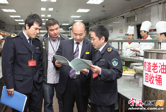 宁海新闻网讯 连日来,县食安办组织县食品药品监管局、环保局、质监局、卫生监督所等单位,对重点食品生产经营单位的废弃食用油脂处置管理情况进行检查,对部分废弃食用油脂处置方式与设施不到位的企业发出整改通知,切实保障公众食用油安全。图为昨日有关执法人员正在城区一家酒店对其煎炸老油的规范处置管理开展检查。(记者惠广亮摄)