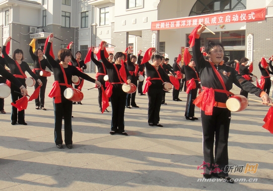 宁海新闻网讯 11月24日,跃龙街道杜鹃社区喜洋洋腰鼓队正式成立。该社区汇景嘉园的居民都是前张、后张、汪家三村村民因拆迁移居来的。为使村居更好地结合,让广大村民积极融入社区,共建社区,参与社区活动,社区特意为喜欢腰鼓的妇女请来了腰鼓教练,既丰富了居民们的业余文体生活,同时也提升了大家对社区的认可度和归属感。 (惠广亮 王银燕 摄) |
