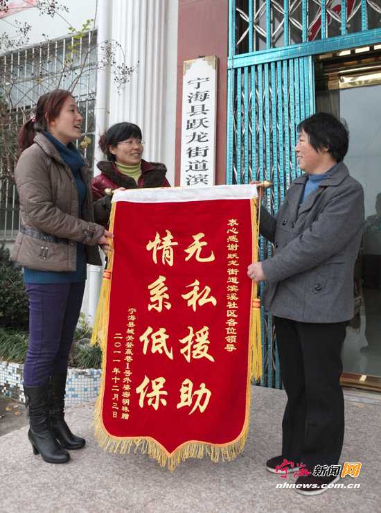 宁海新闻网讯 日前,跃龙街道滨溪社区居民密明珠将一面“情系低保,无私援助”的锦旗送到社区党总支书记的手中,以表达对社区的感激之情。居民密明珠家境困难,与上小学的外孙女相依为命。近年来,社区党组织与共建单位一起与她外孙女结对助学,逢年过节还送去慰问金及慰问品,共同帮助这个困难家庭。(姚亮林应摄) |