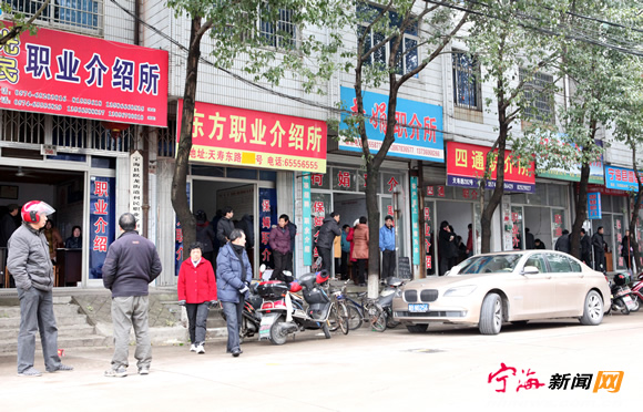 宁海新闻网讯 春节刚过,昨日上午,天寿东路10来家中介公司又开始忙碌起来,百余名求职与招聘人员相聚在这里,寻找着合适的工作和满意的工人。招中介工作人员介绍,求职的基本都是外来务工人员,大多都是初小文化,有特长的不多,但他们对工资及其他待遇的要求比上两年有所提高。(记者李江林摄)