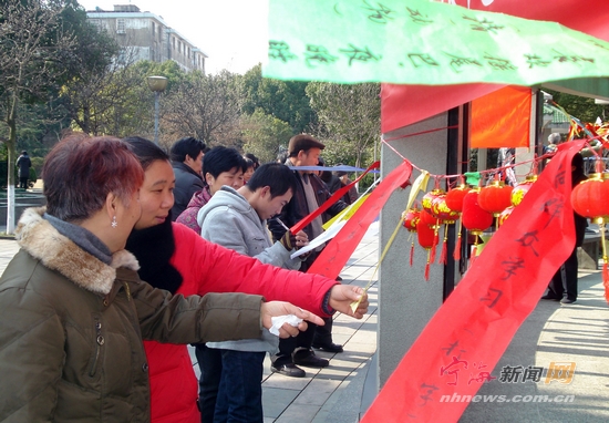 宁海新闻网讯 昨日下午,东海社区主办的“多彩谜语闹元宵,老少同乐庆元宵”猜谜语活动在一休公园举行。数百条花花绿绿的谜语激起现场居民浓厚的兴趣,他们三三两两围在一起互相交流猜谜,为元宵佳节增添了几分祥和、喜庆的节日氛围。图为猜谜语活动现场。 (李江林 严利群 摄)