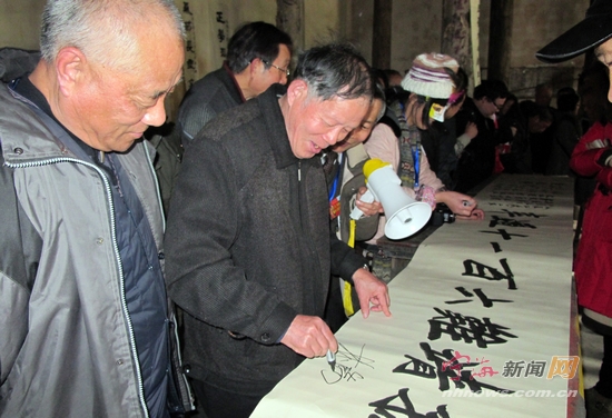 宁海新闻网讯 前日,在欣赏了前童元宵行会之后,宁波市“文保狂人”杨古城带领他的150名队友来到方孝孺在前童的讲学地——石镜精舍,开始了他们在元宵节的别样文化旅途。在石镜精舍内,文人墨客书写长卷发起“方孝孺靖难610周年纪念活动”,追溯方孝孺与前童的渊源,祭拜方孝孺塑像。图为宁波市民在纪念活动中签名留念。 (李江林 严洁摄) |