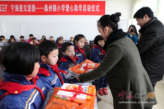 宁海新闻网讯 前日下午,宁海景文团委“红领巾爱心助学计划”在桑洲镇中心小学举行。30名贫困学子高兴地从叔叔阿姨手中接过新书包、文具盒、铅笔和课外书。据了解,景文团委“红领巾爱心助学计划”实行一对一结对助学,与30名桑洲山区的小学生结成对子,直至他们小学毕业,并为他们建立成长档案,帮助解决部分贫困学生的实际困难。(记者 李江林 摄) |