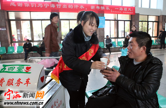 宁海新闻网讯 “同志,天气冷,请喝杯热茶暖暖身子”。昨日上午,县客运总站工作人员学雷锋志愿者正在为候车的乘客端水。今年3月5日是毛泽东主席“向雷锋同志学习”题词49周年纪念日,为更好地继承和发扬雷锋精神,县客运总站全体员工以雷锋为学习榜样,从本职工作做起,从身边小事做起,让雷锋精神温暖每个乘客、温暖整个车站。(记者李江林摄) |