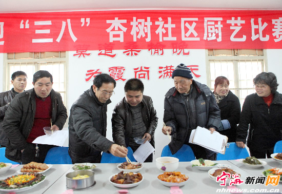 杏树社区举行迎“三八”厨艺比赛活动,居民们热情高涨,辖区内的60户居民报名参加,评委们对红烧肉、糖醋排骨、清蒸鱼等60只参赛菜肴逐一评选,活动欢乐而热闹。(李江林柴溢摄)