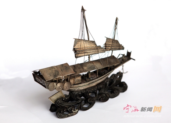 宁海新闻网讯 日前,市民张先生来到县新闻中心,向记者展示他十几年前在一市箬岙收藏的一艘纯银打造的银船。这艘银船长约20厘米,高20厘米,制有炮台、舵、桅杆、船帆、篷顶、铁锚、清兵等,银船托底由名贵的紫檀木精制而成。有温州客人愿出高价购买被他拒绝,他说:不想让宁海的“宝贝”流向外地。这艘清代银船究竟是干什么用的,古代箬岙一带是不是属于海防要塞,对当地的历史有没有研究价值,张先生盼有心人指点。 (记者 李江林 摄) |