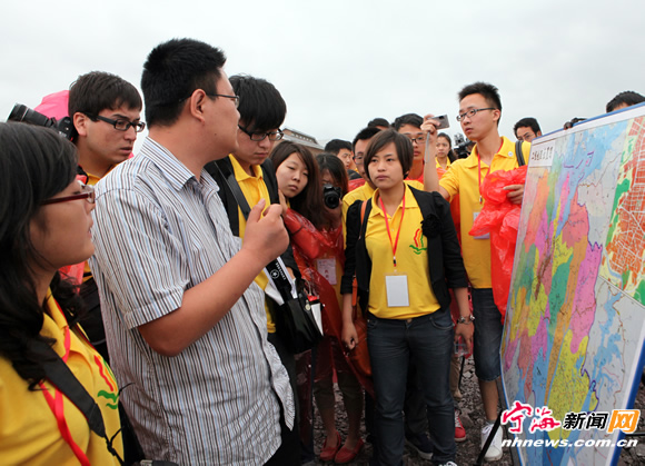 宁海新闻网 昨日上午,100多名大学生代表参加2012·全国百所高校学生寻访徐霞客足迹活动纪念石揭幕仪式后,分组来到三门湾新区建设工地、长街镇、胡陈乡等地参观工程建设和科技农业及新农村建设成就。图为三门湾新区有关负责人正在向大学生代表介绍三门湾新区建设情况。 (记者 李江林 摄)