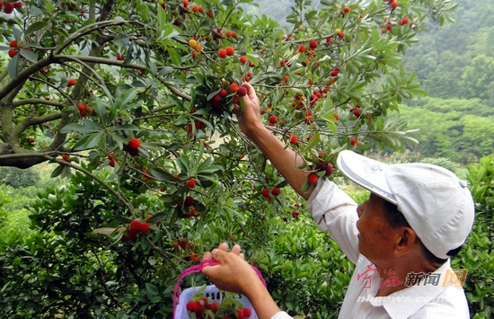 宁海新闻网讯 昨日上午,桥头胡街道涨家溪村杨梅种植户钟锡恩正在选摘杨梅。今年钟锡恩种植的“荸荠”杨梅在我县率先上市,市场零售价每公斤达20多元。由于近期雨水多,本地杨梅的采摘受到一定的影响。 (李江林 李巧萍 摄)