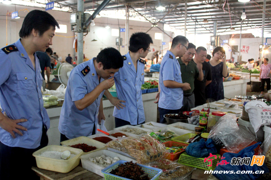宁海新闻网讯 日前,大佳何镇联合桥头胡工商所对大佳何菜市场进行了突击检查,并抽取了15个摊位、4家商店的商品,现场对抽检样品进行食品添加剂检测,未发现菜市场抽检样品有滥用食品添加剂现象,但附近有2家商店存在销售过期食品的现象,工商人员对过期食品直接收缴。 (李江林 何琼摄)