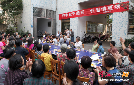 宁海新闻网讯 昨日,跃龙街道松竹社区举行了“迎中秋话团圆邻里情更浓”活动,辖区里的空巢老人、低保户等居民也纷纷参加,大家欢聚一堂,一边吃着月饼,一边共叙邻里情,戏曲爱好者更是踊跃表演,赢得了阵阵掌声。(惠广亮钟俊俏摄)