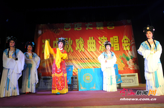 宁海新闻网讯 9月28日晚,由西店镇文体站、老体协、总工会联合举办的“迎中秋庆国庆”戏曲联欢晚会在西店镇双屿公园举行。整台晚会全部由西店镇各村村民自编、自导、自演,并结合了浓郁的西店地方文化特色。精彩的节目表演给群众带来了欢乐,受到了大家的热烈欢迎。图为越剧表演《打金枝之闯宫》。(李江林童瑶摄) |