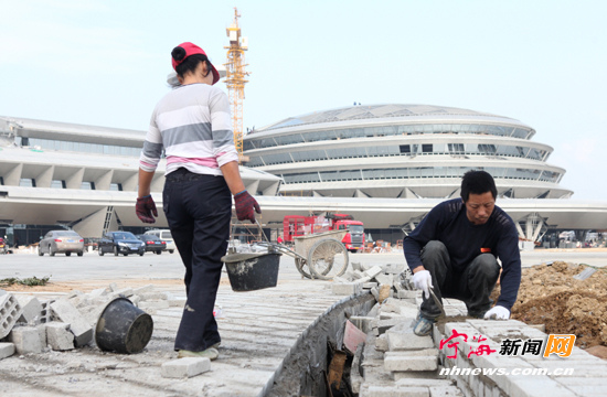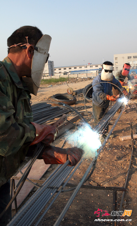 县会展中心工地施工人员争分夺秒赶工期。 (记者惠广亮摄)