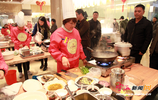 宁海新闻网讯 日前,首届深甽镇乡土特色菜评选活动在深甽天明山温泉大酒店举行。从深甽各酒店、农家乐中选拔出的17位厨师代表现场烹饪制作了41道特色菜肴,各道菜的原材料均产自深甽本地。最终“深甽烤鸭、烤笋、龙盘菜”等15道菜肴获得评委们的一致认可。 (李江林赵士超摄)