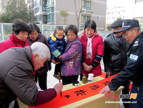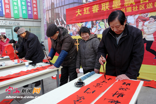 近日,塔山社区邀请辖区书法爱好者,在东景花园开展送春联活动。 (李江林王彦乃摄)