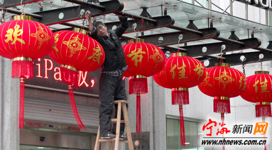 宁海新闻网讯 随着蛇年春节的即将到来,一股新春的气息悄然弥漫在缑城的大街小巷,街头的商家与市民的庭院纷纷挂上了大红灯笼,这一串串喜庆的红灯笼映出了人们迎接新春的喜悦和期盼。图为昨日城区一商家的门口,工作人员正在悬挂大红灯笼。(记者惠广亮摄)