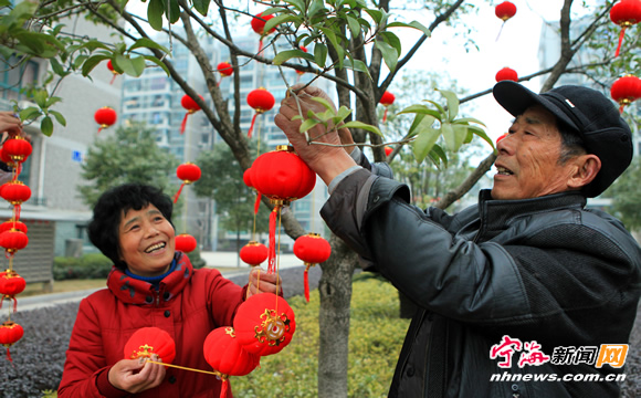 塔山社区工作人员在东景花园等地喜挂灯笼迎佳节。