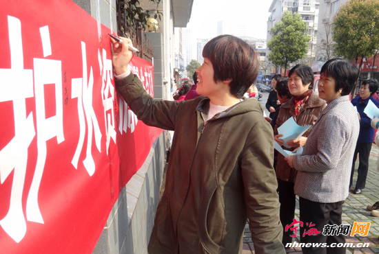 宁海新闻网讯 近日,桃源街道华庭社区开展了主题为“共同关注水资源 保护水环境”的科普宣传活动,通过大幅宣传画报展示、向辖区居民发放节水倡议书等,大力宣传保护水资源和节水理念,得到了大家的积极响应。图为居民纷纷在宣传横幅上签名表示共同关注水资源,保护水环境。 (惠广亮陈浩良摄)
