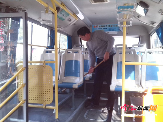 128路公交哥把车厢当成自家客厅来打扫——赞一个!