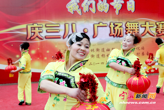 宁海新闻网讯 昨日下午,梅林街道在杨梅岭村文化礼堂广场开展“我们的节日”广场舞比赛,以庆祝“三八”国际妇女节。来自该街道14个村的代表队参加了比赛,自编自演的精彩节目赢得了广大村民的阵阵掌声。图为梅林街道方前村的农家女正在高兴地跳着《欢天喜地》舞蹈。 (李江林徐丽摄)