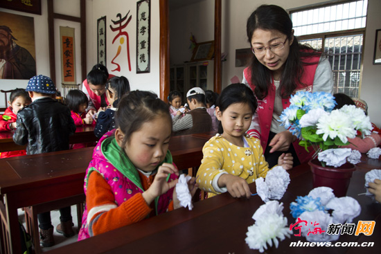 近日,岔路镇学前教育中心组织开展“文明祭祀低碳过清明”活动,小朋友在老师的指导下,学做小纸花,希望通过小手拉大手效应,带动更多人参与文明祭祀活动。 (通讯员周衍平摄)