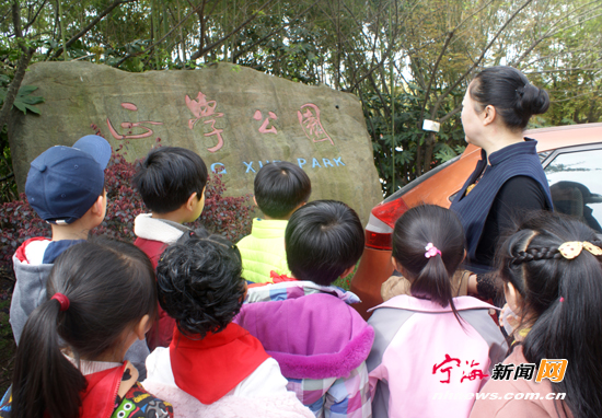 近日,潘天寿小学老师带领一年级学生踏春时,正在给学生讲述正学公园与方孝孺的故事。潘天寿小学在每年组织学生远足春游活动时,都会结合我县的人文历史,给每个年级都安排一个不同的主题教育内容,以丰富踏春活动的教育内涵。 (记者惠广亮通讯员叶贤仁摄)